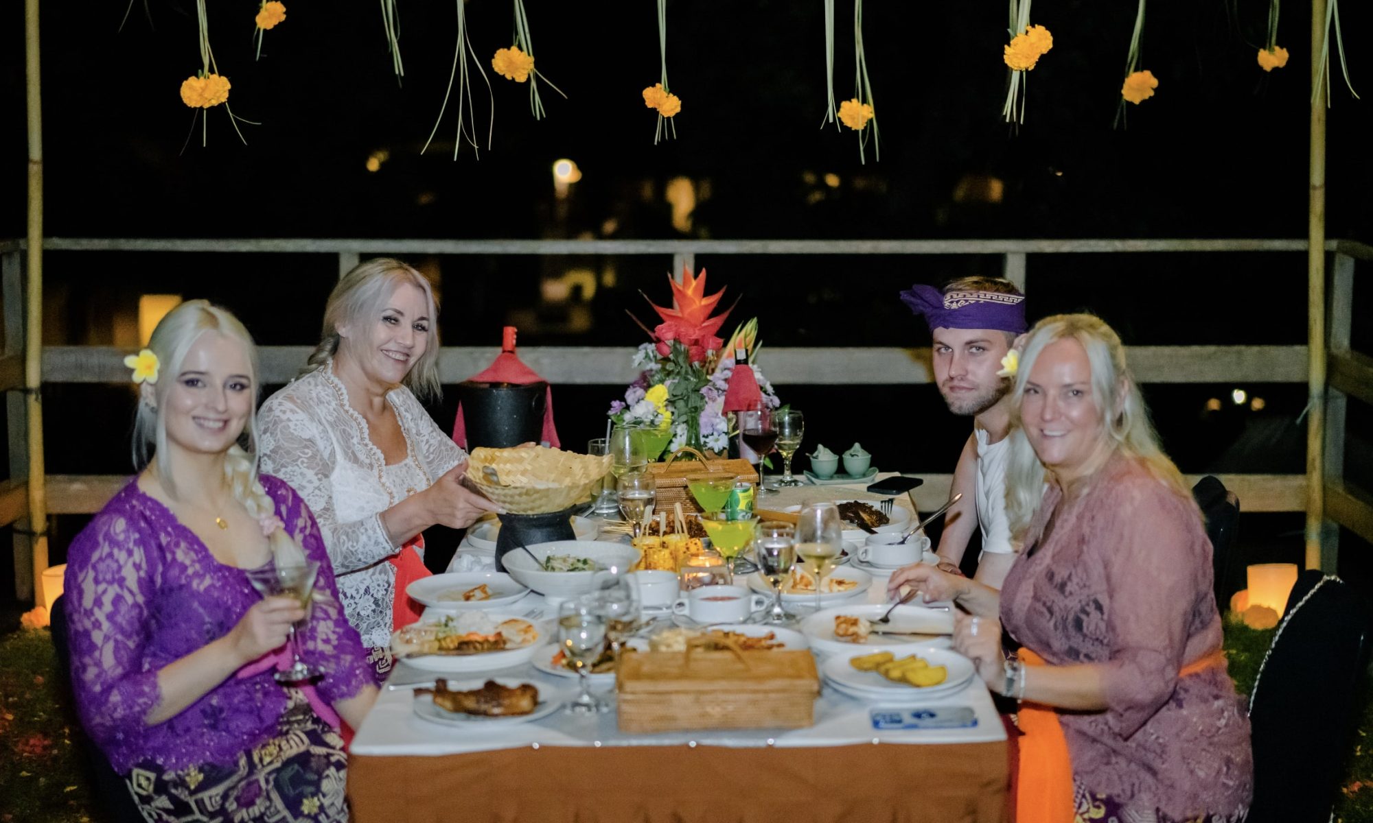 Includes: Private Live BBQ Dinner   |   A bottle of local wine  |  Simple Balinese custom dress-up   |    Flower & Candle set-up